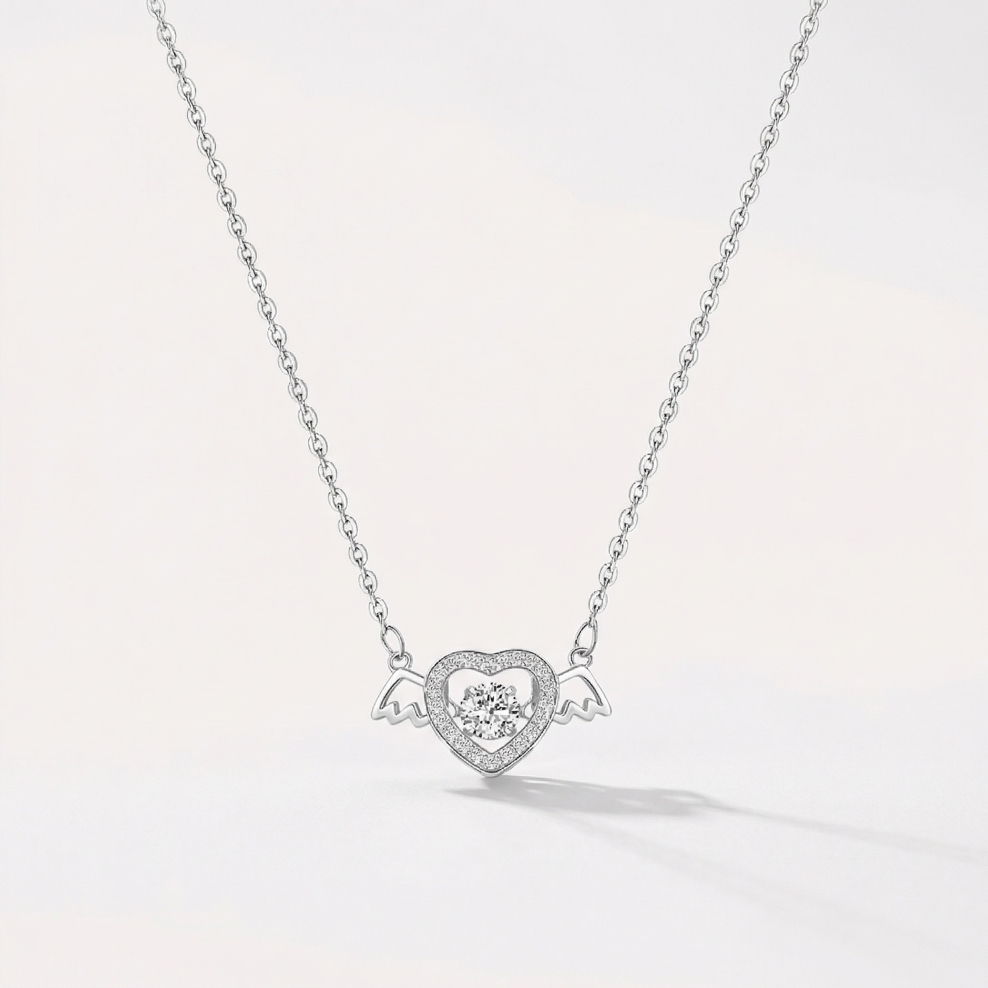 The Angel Heart Necklace holds a dancing stone at its center—a heart framed by delicate wings. Crafted from recycled 925 sterling silver, the stone moves with you, catching light in quiet moments.