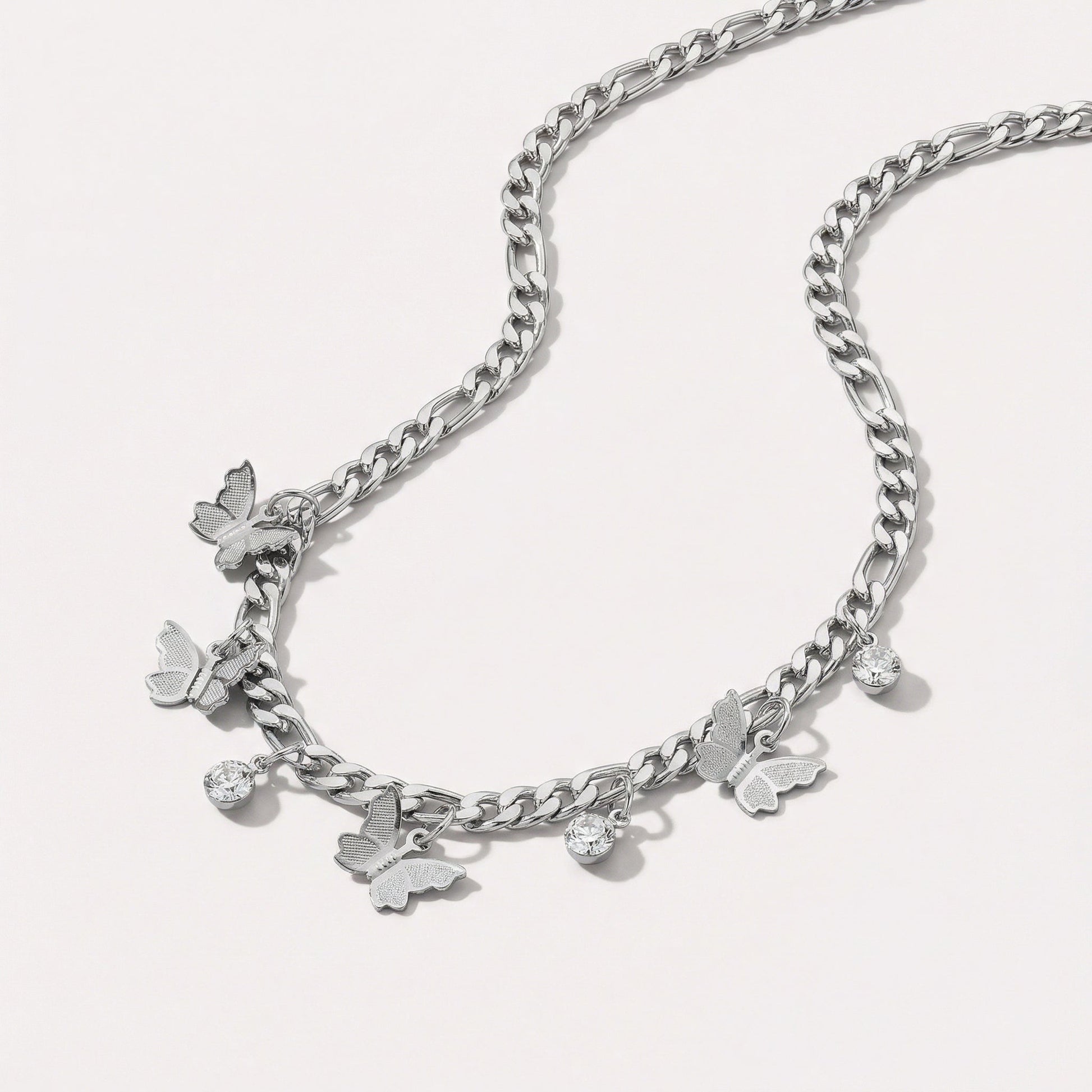 Butterflies and crystals on a chunky gold chain—the Butterfly Necklace is the kind of piece that gets noticed. It's playful without being too sweet, bold without being too much. Crafted from recycled alloy, it sits perfectly at the collarbone and works with everything from a white tee to your favorite blazer.